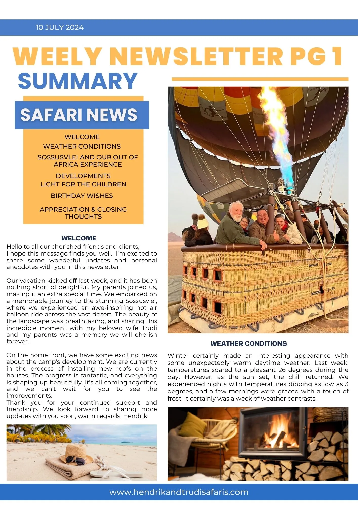 Unser Urlaub hat letzte Woche begonnen, und es war wunderbar, dass meine Eltern uns begleitet haben. Wir reisten nach dem atemberaubenden Sossusvlei und genossen eine Fahrt im Heißluftballon über die Wüste. Dieser Moment mit Trudi und meinen Eltern war wirklich besonders. Im Camp installieren wir neue Dächer auf den Häusern, und es sieht großartig aus.